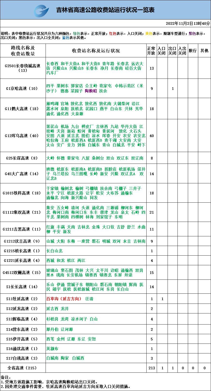 吉林省高速公路收費站運行狀態(tài)一覽表2022年11月2日